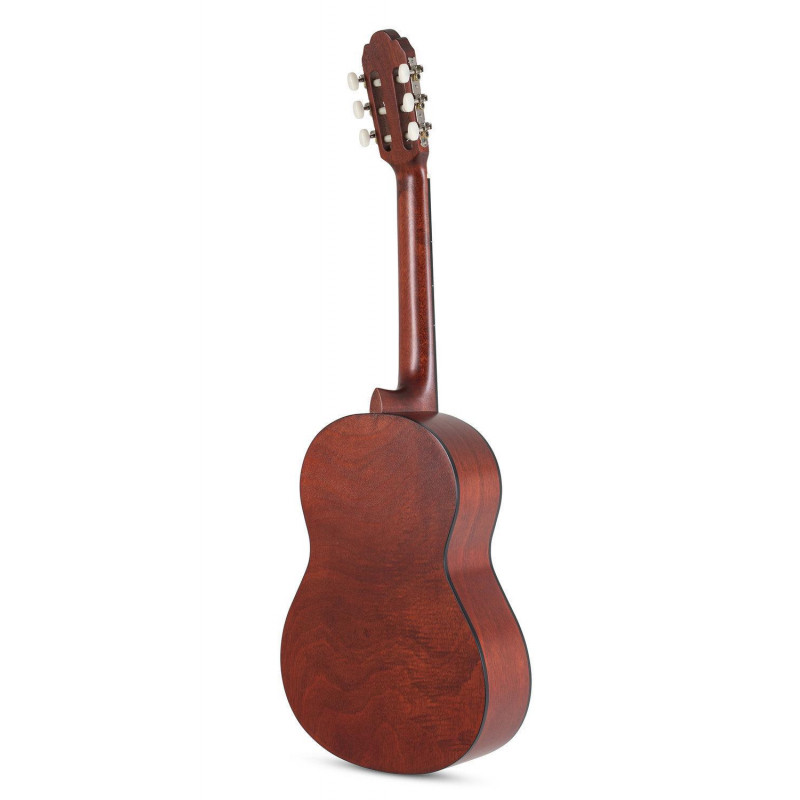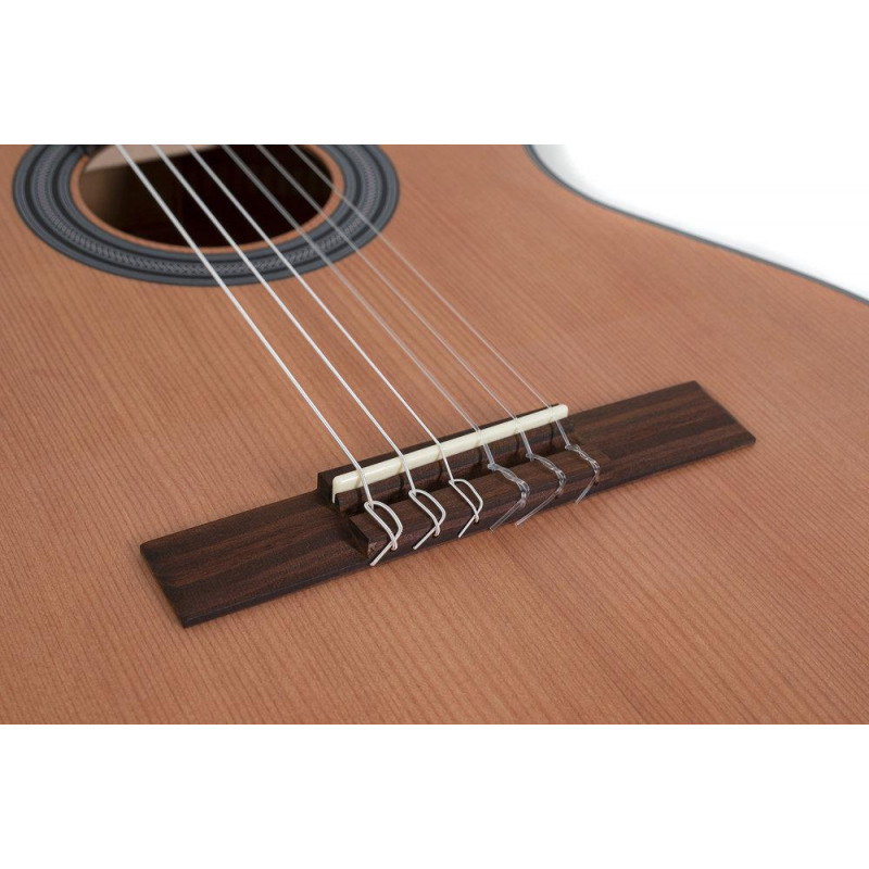 Tapa de cedro. Aros y fondo de Okoume. Mástil de Okoume con refuerzo de carbono.. Ribetes de ABS. Diapasón y puente de Blackwood Tek. Trastes de alpaca. Clavijas de afinación cromadas. Lacado mate ecológico al agua. color natural. Tamaño 3/4 Größe. Escala 590mm. Cejuela 48mm.