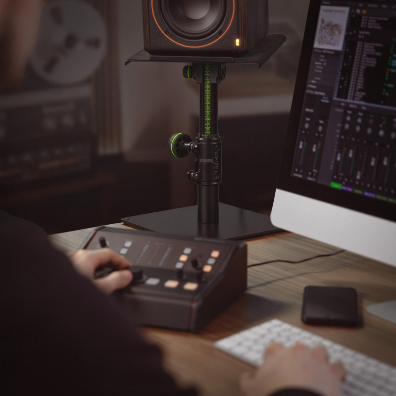 El correcto posicionamiento de los monitores tiene una influencia decisiva en el sonido y en la percepción de la mezcla. Pero cuando se tiene un estudio en casa, no siempre hay suficiente espacio para colocar los monitores de estudio con los soportes adecuados al lado de la mesa. El SP 3102 de Gravity es la solución a este problema. Se trata de un soporte versátil de acero texturizado que cabe en casi cualquier escritorio. La longitud lateral de su base maciza tan solo mide 25 cm. Puedes poner cajas de monitores que pesen hasta 25 kg a la altura que quieras, así como girarlas 360° en horizontal e inclinarlas hasta 15° gracias al relleno de EVA y a la protección contra vuelco. Por lo tanto, la colocación de los monitores de estudio dejará de ser un obstáculo. Además, los anillos G de colores son un claro elemento de diseño y se pueden cambiar fácilmente en cuestión de segundos. Con el producto ya viene incluido un juego de anillos negros