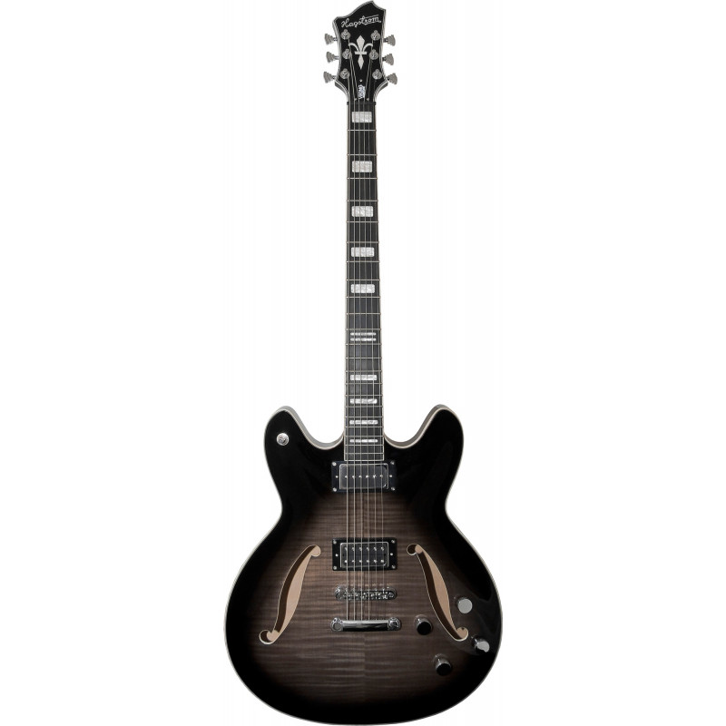 GUITARRA DE CUERPO SEMI-HUECO 'Viking Baritone DLX - Cosmic Black Burst, Contoured Ply-Maple Semi-Hollow body, Maple Set-Neck, Long throw T-O-M Bridge, Hagstrom Trapeeze, 1 x P-Urified (P-90) Alnico 5, 1 x Custom 58'C Alnico 5, 2 x Vol RC-Circuit, 2 x Tone, 3-Way Pick-up Toggle Switch, 28.00'' Scale Length, H-Expander Truss Rod, 18:1 Hagstrom Tuners, Resinator Fretboard'
