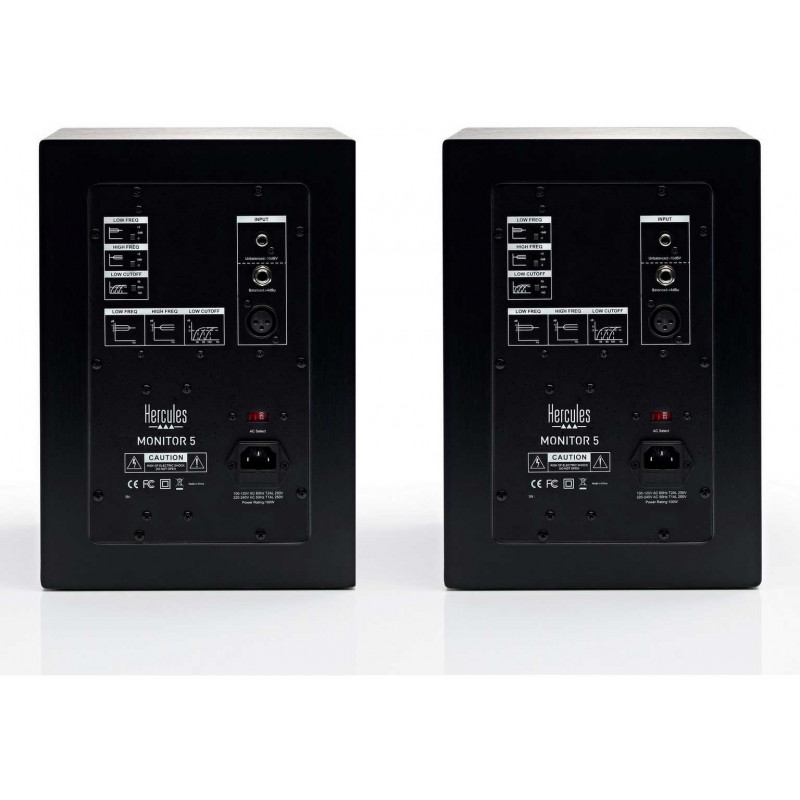 PAREJA DE MONITORES DE ESTUDIO ACTIVOS Basándose en la experiencia adquirida al crear los altavoces Hercules DJ Monitor 5 — ampliamente aclamados por la comunidad de DJing por su precisión y accesibilidad excelentes — los ingenieros de Hercules han puesto el máximo cuidado al desarrollar los altavoces Monitor 5, la nueva generación. Cada uno de estos altavoces de monitorización incorpora un woofer de 5 pulgadas/12,7 cm para un rendimiento preciso, potente y versátil. Son perfectos para aprender a mezclar, producir las primeras pistas musicales, y también para la creación multimedia.Controles:Interruptor On/Off en el frontal de cada altavoz para facilitar el accesoRueda de volumen maestro en el frontal de cada altavoz para un control más precisoLuz indicadora en posición ONAjuste de alta frecuencia: + o – 2 dBAjuste de baja frecuencia: + o – 2 dBCorte de baja frecuencia ajustable: 56 Hz, 80 Hz o 100 Hz Woofers de 12,7 cmPuertos duales de bajos equilibradosCajas de los altavoces realizadas en MDF de alta densidad80 vatios RMS de potencia de salida por altavozEntradas RCA, TRS (6,35 mm) y XLRDiseño compacto, perfecto para cualquier espacio Entradas de audio (para conectar un ordenador, equipo de DJ, mezclador):RCATRS (6,35 mm, entrada equilibrada)XLR (entrada equilibrada)