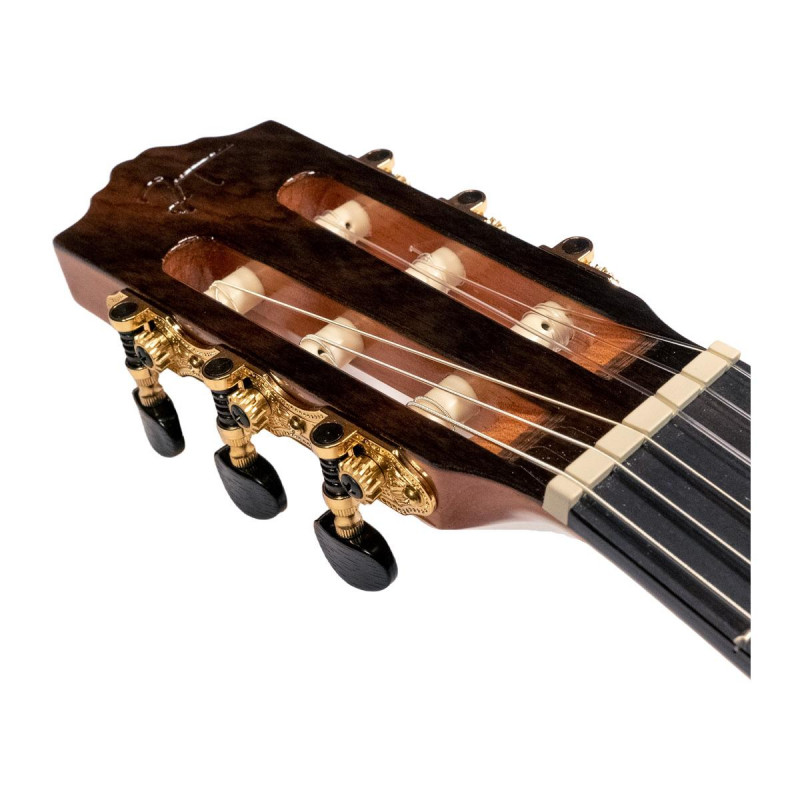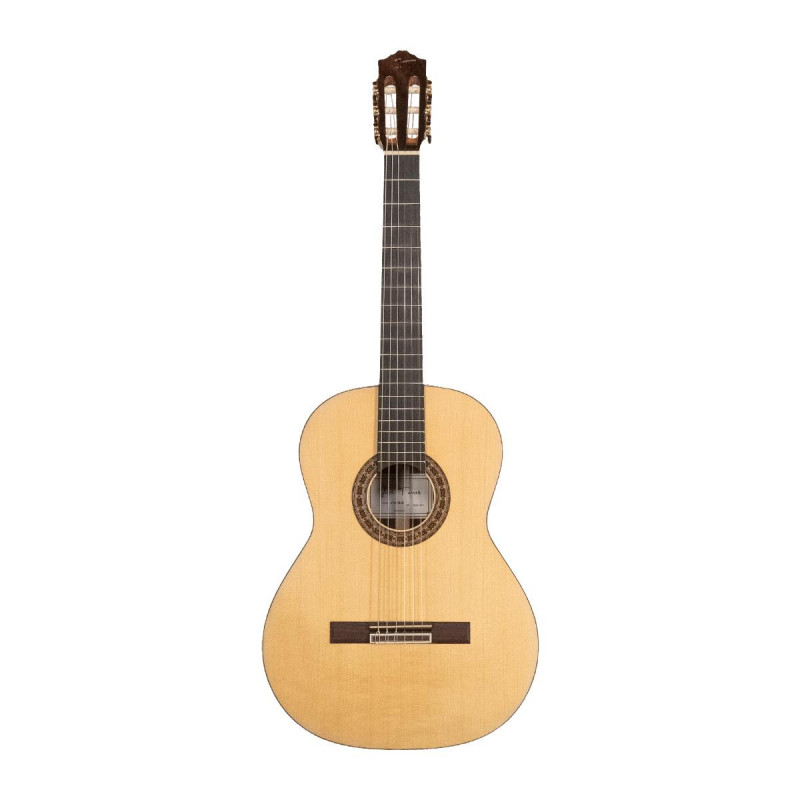 GUITARRA CLÁSICA 4/4 Guitarra clásica. Tapa maciza de abeto. Aros y fondo macizos de palosanto de la India. Mástil de cedro. Diapasón de ébano. Cejuela de Poliacetal (POM) 52mm. Puente de palosanto. Clavijero dorado. Ribeteado de palosanto de la India. Escala 650mm. Acabado brillante.