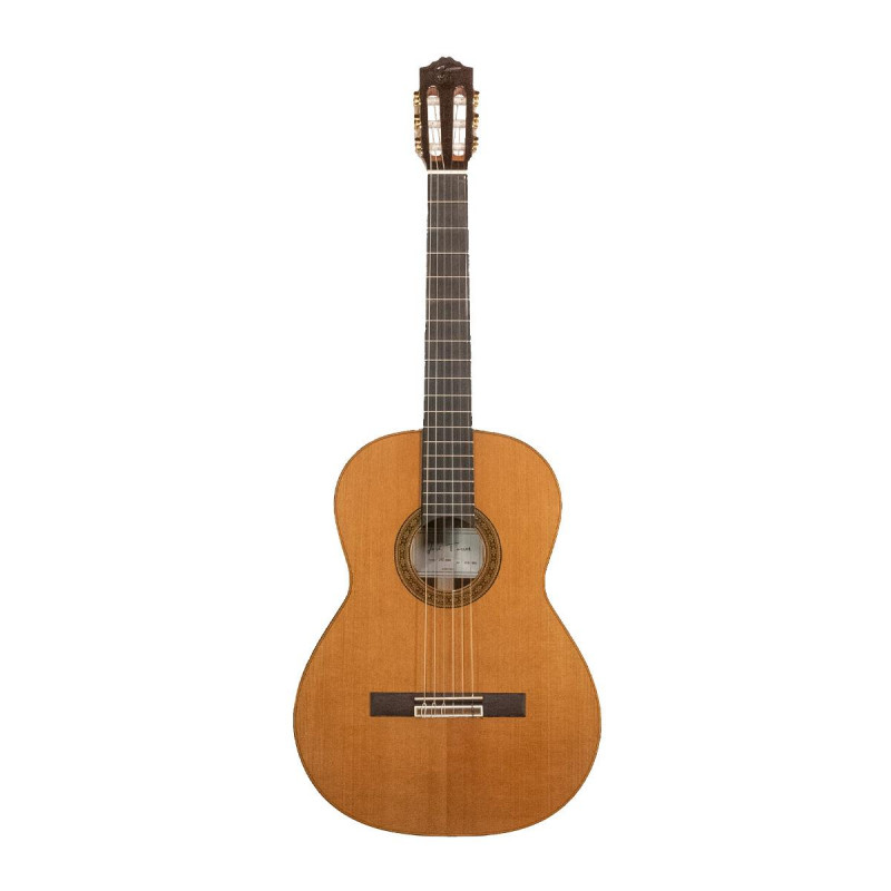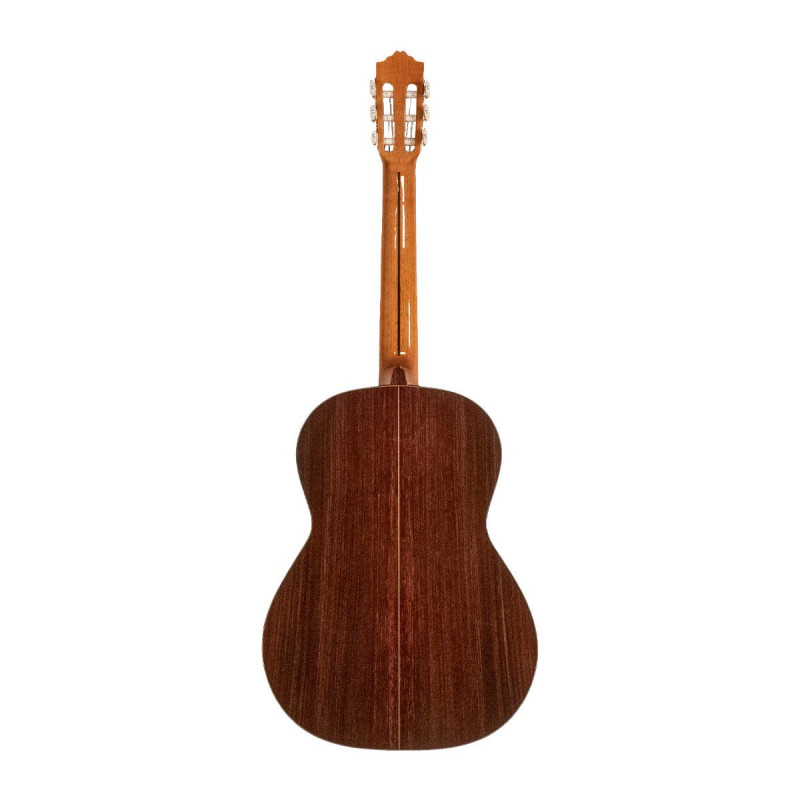 GUITARRA CLÁSICA 4/4 Guitarra clásica. Tapa maciza de cedro. Aros y fondo macizos de palosanto de la India. Mástil de cedro. Diapasón de ébano. Cejuela de hueso 52mm. Puente de palosanto. Clavijero dorado. Ribeteado de palosanto de la India. Escala 650mm. Acabado brillante.