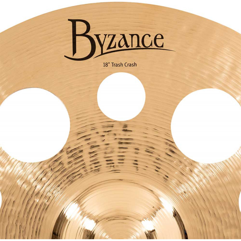 PLATO CRASH 'Trash Crash 18'' Serie Brilliant. Los platos la serie Byzance Brilliant están fabricados artesanalmente en nuentra fábrica de Turquía por las manos de especialistas y respetando la tradición en todo el proceso. Todos los platos están hechos a partir de galletas de aleación de bronce B20. En el proceso intervienen varias técnicas, tanto de martilleado como de torneado. Además de ello reciben un lacado brillante que les infiere un sonido más explosivo y un acabado brillante espectacular.