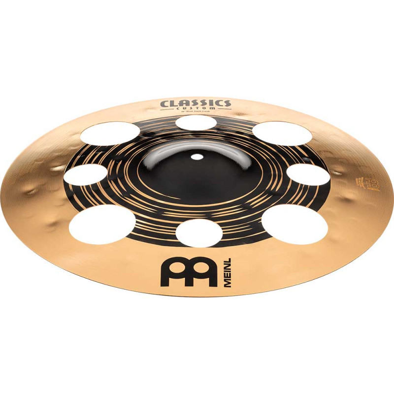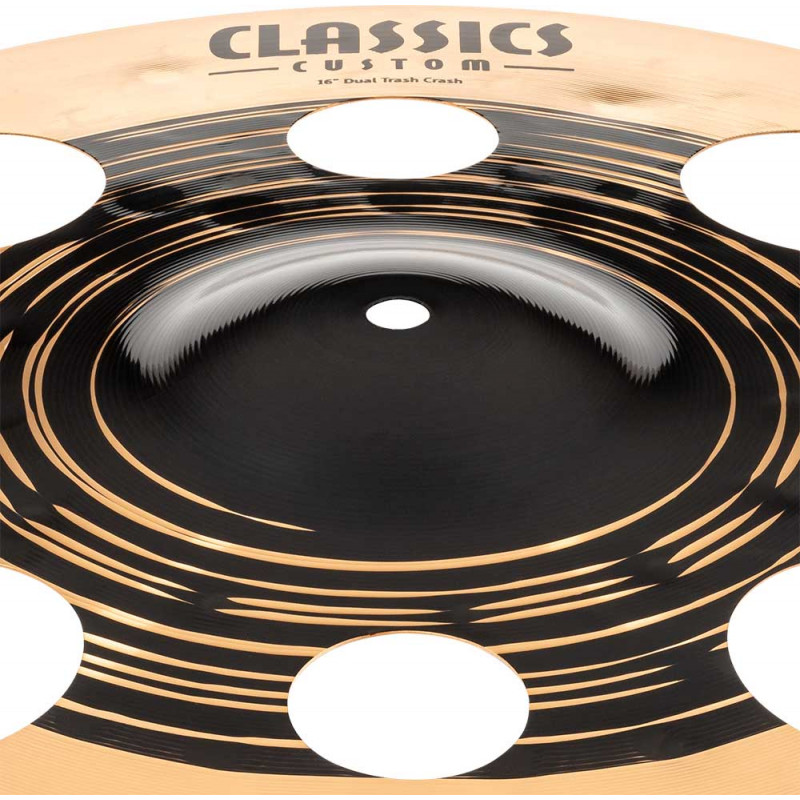 PLATO CRASH 'Classics Custom Dual 16'' Trash Crash. Los nuevos Classics Custom Dual tienen una presencia espectacular. Pero lo es más su propuesta sonora. Basados en un tono cálido, el borde exterior tornado y pulido hace que tenga un tacto flexible así como una respuesta rápida al golpearlos. Además, la parte central oscura hacen que mantenga un carácter explosivo y poderoso. Los platos están hechos en Alemania sobre una aleación B12. También nos parece importante reseñar que están hecho 100% con energía renovable y autoproducida por nosotros mismos.