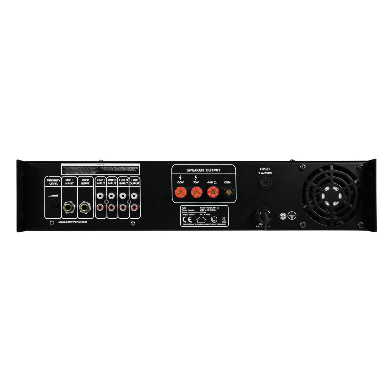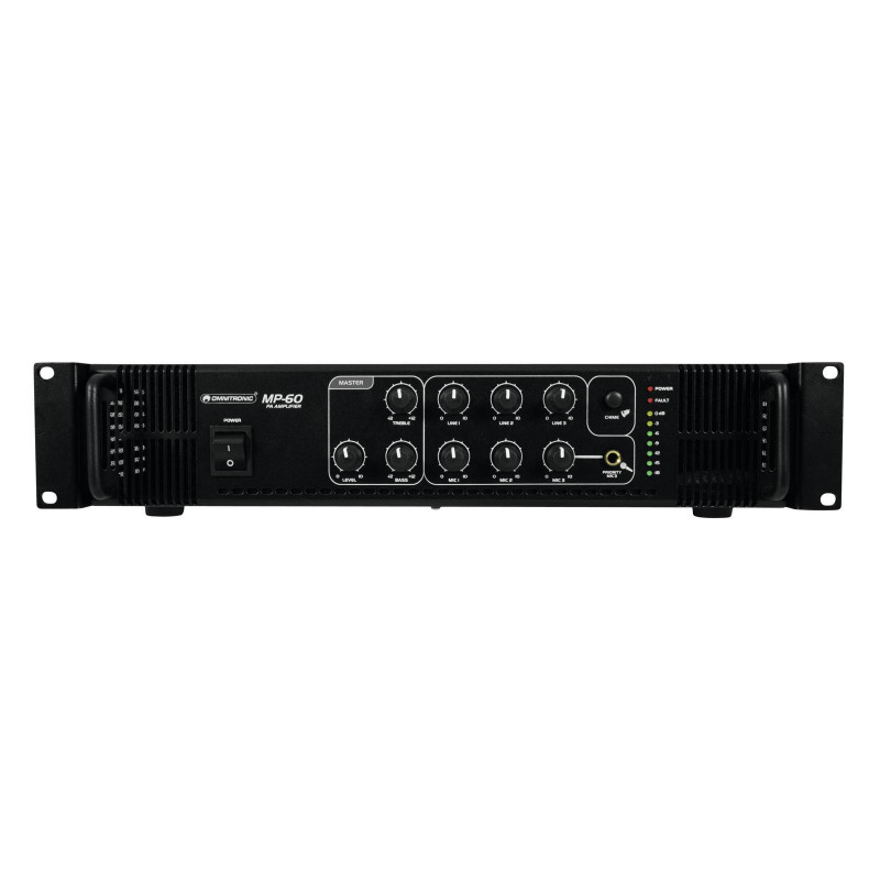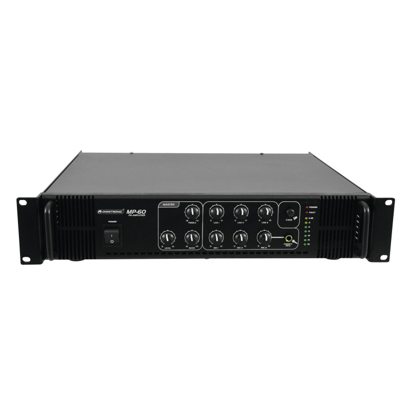 Alta confiabilidad con la máxima flexibilidad El amplificador de mezcla Omnitronic MP-60 ELA es su socio confiable cuando trabaja con sistemas de sonido ELA. Gracias a su formato de 19 ", es ideal para instalaciones móviles y fijas. Las salidas para altavoces ELA con transformadores de audio de 70 V y 100 V o altavoces de 4-16 ohmios no dejan nada que desear. Además, también puede conectar un dispositivo con nivel de línea (p. ej., consola de mezclas) a la salida de línea. Con 6 entradas mezclables, siempre permanece flexible. Conecte hasta 3 micrófonos y 3 dispositivos de nivel de línea. Los anuncios son una prioridad La entrada de micrófono 3 en el panel frontal ofrece un circuito de prioridad ajustable Le permite hacer anuncios importantes con una reducción de nivel automática y continuamente ajustable de todas las señales. Use el gong para señalar adicionalmente su anuncio. Funciones de protección Un ventilador protege el interior de su MP-60 del sobrecalentamiento. Además de un interruptor- en retardo, tiene circuitos de protección contra sobretensiones y cortocircuitos. En estos casos, sus altavoces están aislados eléctricamente del amplificador. El LED de FALLA se enciende y tanto el MP-60 como el yo Nuestros altavoces están protegidos contra daños.