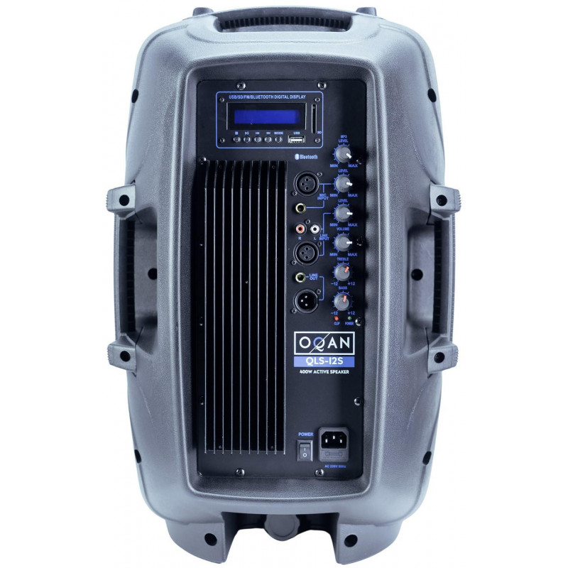 ALTAVOZ DE PA AMPLIFICADO Recinto activo multifunción biamplificado. 400W de Potencia de Pico – 200W RMS. Clase AB. Altavoz de 12''. Impedancia 8 Ohm. Respuesta de frecuencia 50Hz-20Khz. Ecualizador de dos bandas. Entrada Mic (XLR y Jack 1/4') , Aux IN (XLR y RCA)/MP3. Salida Line OUT (XLR). Ecualizador de 2 Bandas. Reproductor de USB, SD, Bluetooth y Radio FM integrado. Control Remoto IR. Pantalla LCD. LED de Encendido y Saturación. Vaso estándar de 1-3/8' (35mm). Posibilidad de uso como monitor de suelo. Peso aprox 10Kg. Dimensiones 380x 300 x 575 mm.