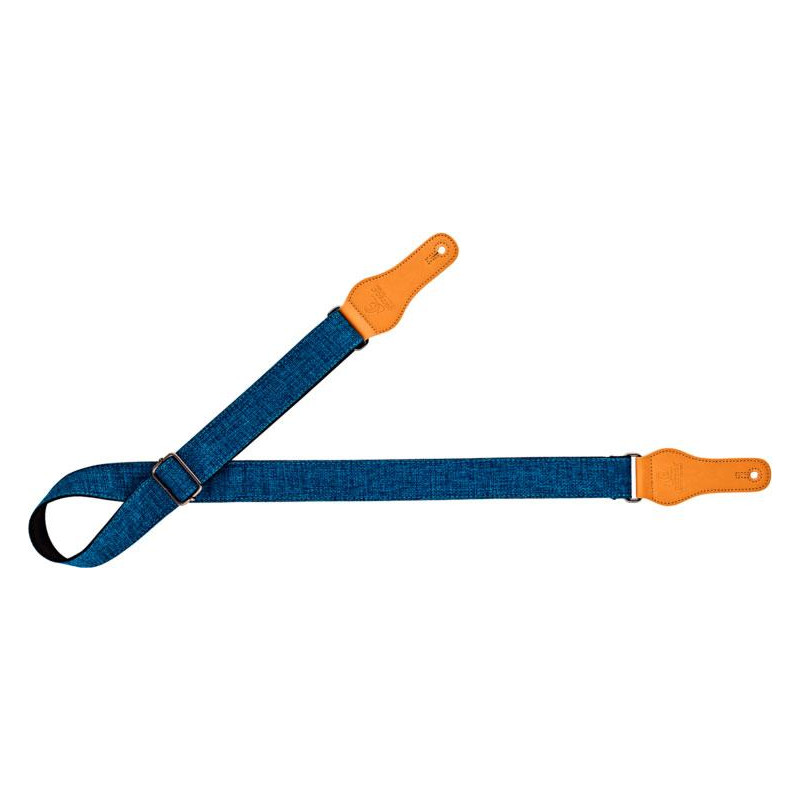 CORREA DE GUITARRA / BAJO Correa de algodón para ukelele de la serie``Casual´´. Color AZUL. Extremos en poli piel flexible color camel con troquel que se ajusta a cualquier enganche de ukelele. Medidas: 37mm de anchura y 1390mm de longitud máxima.