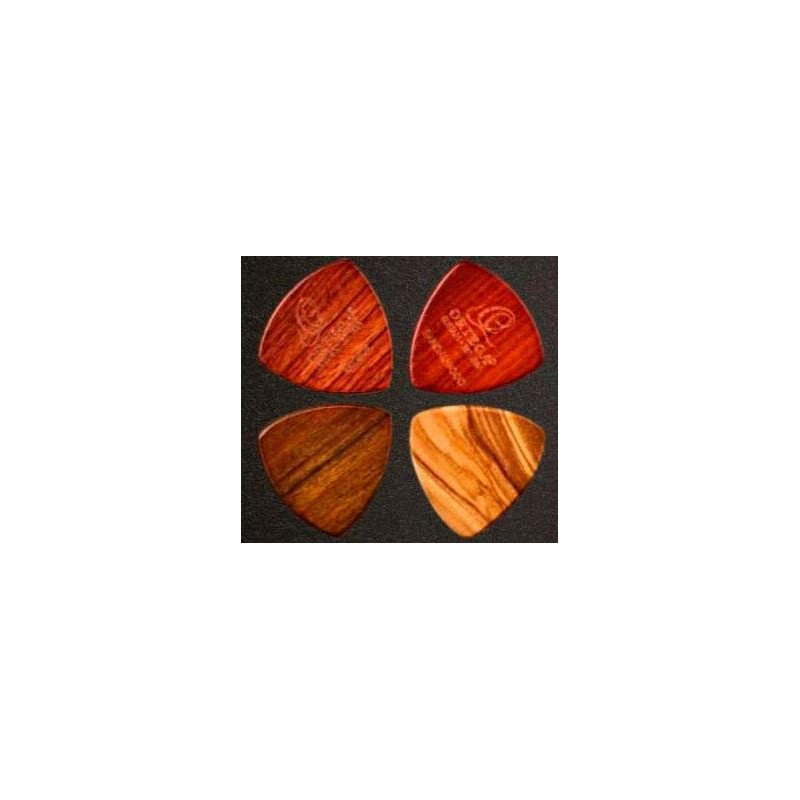 PACK DE PÚAS Pack de 4 puas de madera. Tamaño triangular XL con rebaje para pulgar y grosor de 2,5mm. Fabricadas a mano en 4 tiposd e madera: Ovangkol, padouk, sándalo y chacate.