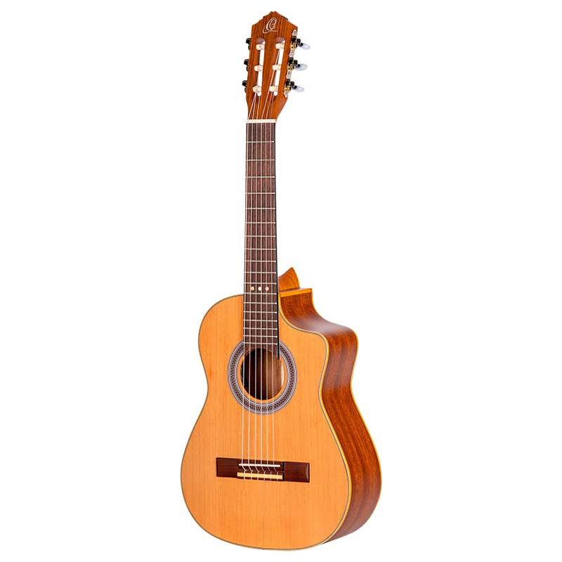 GUITARRA CLÁSICA 3/4 RQ39E Requinto electrificado de estilo Mexicano con cuerpo profundo. Tapa maciza de cedro en acabado natural satinado. Aros y fodo en sapele satinado. Cuerpo extra profundo de 110mm. Mastil de okoume en acabado gloss satin. Lamina de mogal en tapa. Diapasón y puente de nogal. Electrónica Ortega MagusGo. Funda deluxe incluida.