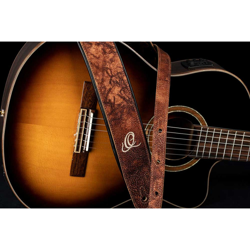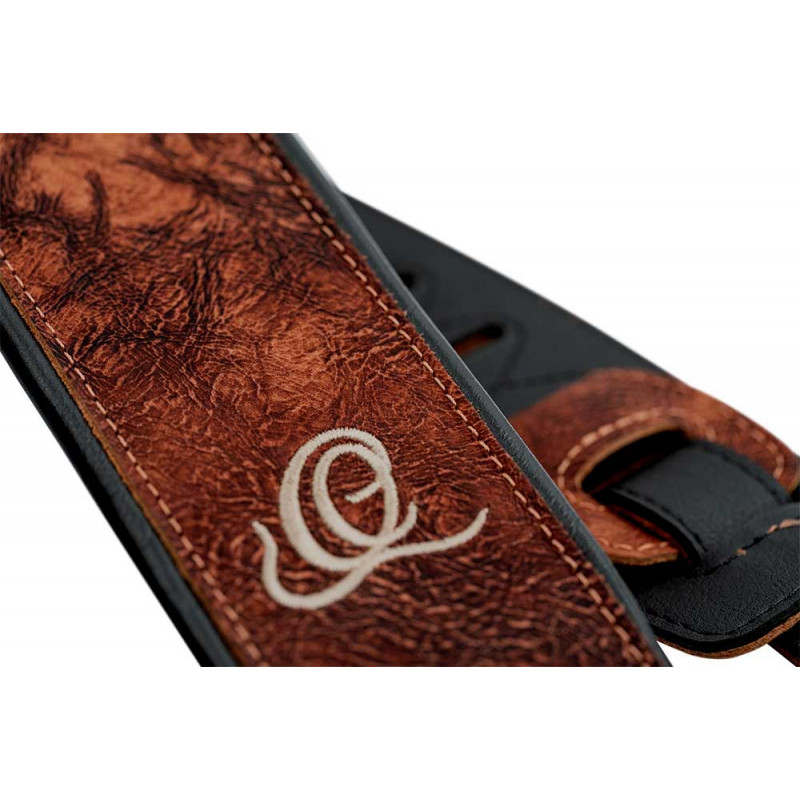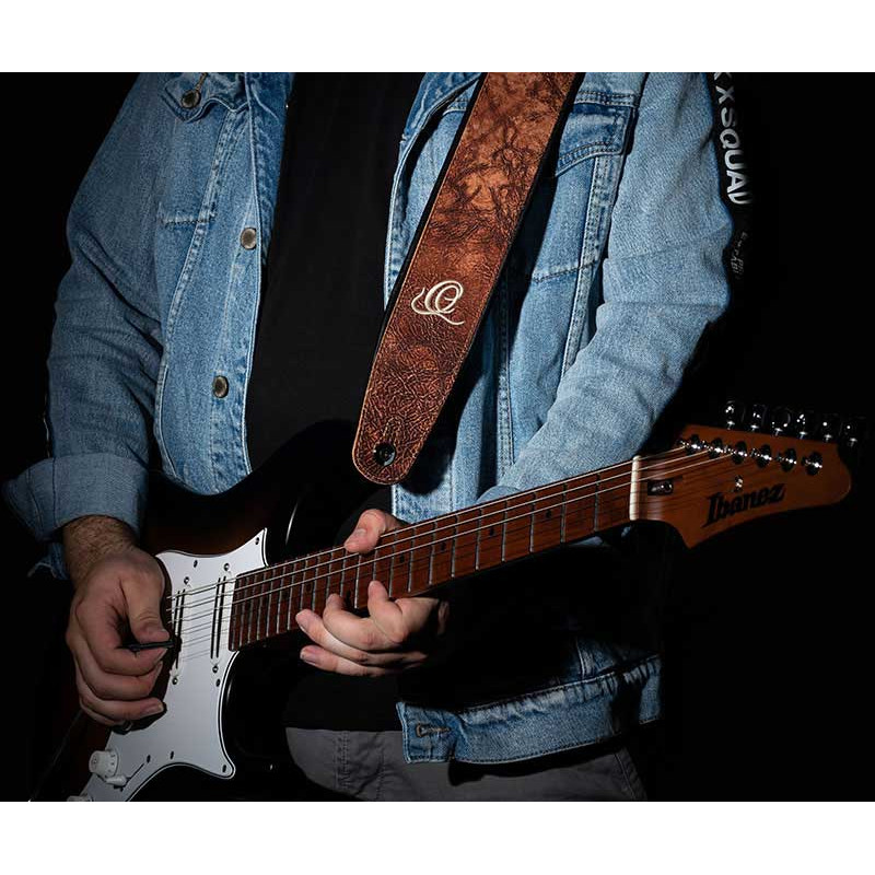 CORREA DE GUITARRA / BAJO Las nuevas correas de cuero genuino de Ortega están hechas a mano en Brasil y ofrecen una excelente apariencia. Gracias al acolchado grueso, su experiencia de juego será más cómoda, incluso durante largas sesiones de práctica y estudio, y presentaciones en vivo. Estos hermosos diseños son absolutamente llamativos.