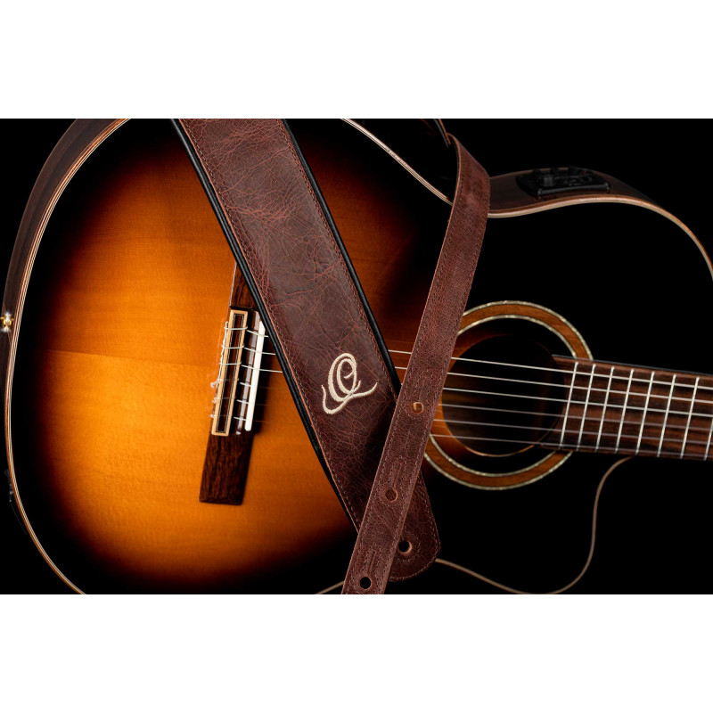 CORREA DE GUITARRA / BAJO Las nuevas correas de cuero genuino de Ortega están hechas a mano en Brasil y ofrecen una excelente apariencia. Gracias al acolchado grueso, su experiencia de juego será más cómoda, incluso durante largas sesiones de práctica y estudio, y presentaciones en vivo. Estos hermosos diseños son absolutamente llamativos.