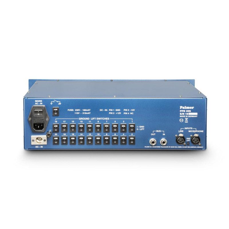 2 x 10 salidas XLR balanceadas por transformador con circuitos de excitación emparejados e interruptores individuales de desconexión de masa en la parte trasera