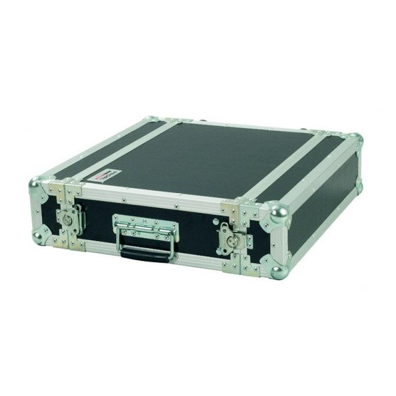 "FLIGTH PARA CASE EQUIPO RACK 19" Maleta rack 19' standard de 2 Unidades. Construida en madera chapada phenólica grado marino de 5 capas con cubierta negra laminada resistente a las rozaduras. Interior pintado en negro. Cierres tipo mariposa en acero, asas superficiales (con muelle), esquinas bola de acero, perfil en aluminio profesional y pies de goma. Raíles de instalación rack estandar en el frontal y tornillos, protectores y nueces incluídos. Profundidad de enracado : 33 cm."