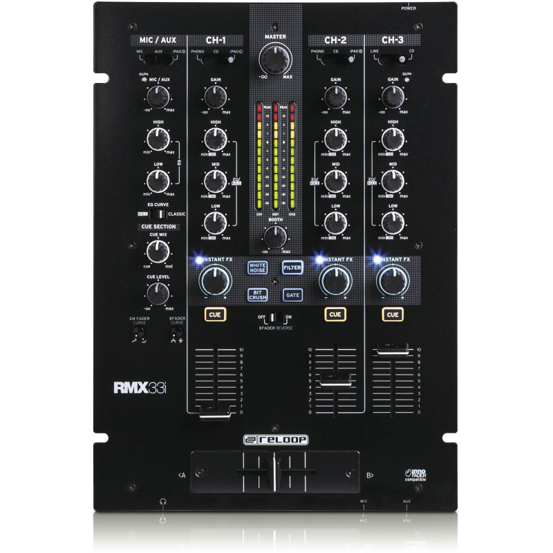 MEZCLADOR DE DJ Mezclador de DJ de 3 canales + 1 (para mic o auxiliar con entrada frontal). Con arquitectura digital y procesador de efectos integrado para añadir color a la señal de forma instantánea. Este mezclador compacto de club nos brinda acceso a la misma calidad de sonido y componentes del RMX-80 a un precio mucho más económico. Dispone de dos cómodas entradas de minijack con las que podemos entrar a losdos canales centrales la salida de un tablet mediante el típico cable divisor que, si bien nos haceperder el estereo es una solución más que aceptable para tener un medio de reproducción de canciones absolutamente versátil y económico como es una tablet, lo que nos da acceso a la música presente en el tablet mismo o, a través de internet, a cuentas de Spotify (de pago) u otros servicios similares de streaming con millones de canciones disponibles. La señal presente en las entradas procedente del tablet, puede desviarse hacia el canal auxiliar, cuando no se esté usando el micro, dejando libres los canales principales.