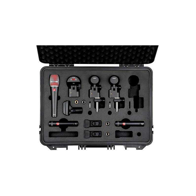SET DE MICRÓFONOS DE BATERÍA Todo lo que necesitas para grabar tu batería y hacer que suene genial - El V Pack Club de sE Electronics le ofrece todos los micrófonos que necesita para activar un kit de batería y hacer que suene genial. Con este pack te llevas un micrófono dinámico de bombo V Kick, dos micrófonos dinámicos V Beat con sus correspondientes abrazaderas V para colocar sobre los aros de los timbales, un micrófono de instrumento dinámico supercardioide V7 X para caja y un par de micrófonos de condensador de diafragma pequeño sE7 para ambientes generales y platos. Todos los micrófonos y accesorios vienen en una super resistete caja de vuelo de plástico apto para llevar de gira y que tiene una espacio vacío para incluir nuestro micrófono de charles favorito.