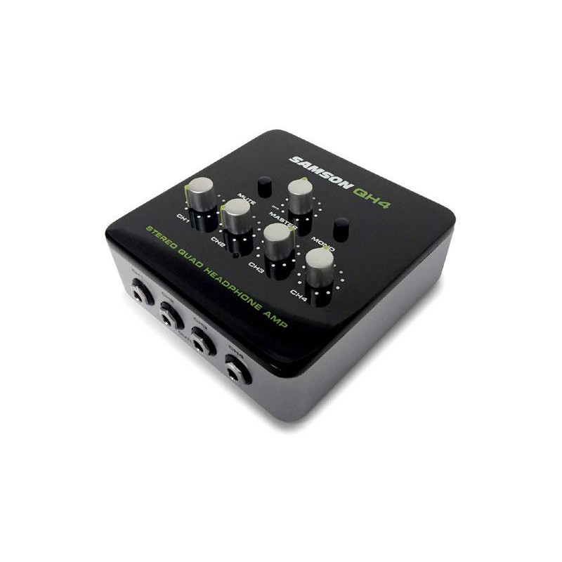 AMPLIFICADOR DE AURICULARES Amplificador de auriculares con 4 canales independientes de salida y control de volumen para cada canal. Entradas: estéreo L + R de 1/4'' balanceada y estéreo 1/8'' (minijack) para poder conectar dispositivos domésticos. Salidas: 4 estéreos 1/4'' y una auxiliar de 1/8''. Conmutadores: MUTE para silenciar salidas y MONO para convertir salidas en señal mono. Potenciómetro de volumen general MASTER. Adaptador de corriente incluido (15 VDC)
