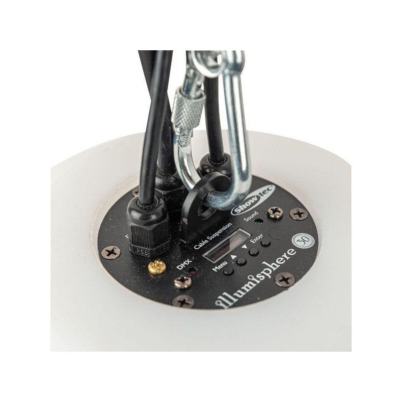 El Showtec Illumisphere, disponible en versiones de 30 cm (41122) y 50 cm (41123), es un LED RGBW muy brillante. Puede funcionar de manera independiente mediante el uso de uno de los programas automáticos disponibles. También puede crear su propia atmósfera personal configurando el color correcto a través de DMX (conexión a través de 3P XLR). Cada Illumisphere está equipado con un ojo colgante dedicado a través del cual la unidad se puede conectar y asegurar en una posición estática. Todo lo que necesita es un cable de seguridad certificado con un SWL de 5 kg. Puede agregar los Illumispheres como captadores de ojos estáticos en cualquier configuración Showtec Illumilift porque ambos sistemas tienen la misma personalidad LED DMX.