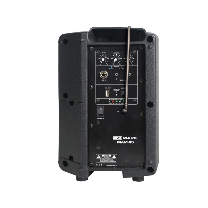 MAM 45 es un sistema de 2 vías que incorpora un transductor de 6.5" y un tweeter de 1". El sistema es auto amplificado y en su parte trasera incorpora un amplificador de 20W Clase D. Integra conexión Bluetooth además de conexión MIC/Línea y receptor VHF para micrófono, el cual viene incluido. MAM 45 integra una batería recargable que proporciona una autonomía de larga duración para que el dispositivo sea portable y en cualquier lugar pueda realizar su función de reproducción y amplificación, además de incorporar en su panel trasero una conexión USB la cual permite conectar y cargar dispositivos externos. El cuerpo del MAM 45 está fabricada en plástico ABS de alta resistencia además de contar para la protección de sus componentes una rejilla metálica.