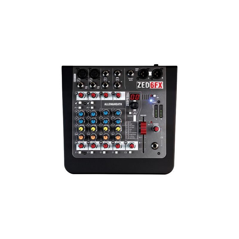 Le ZED-6FX offre l'excellence renouvelée d'Allen & Heath en matière de construction et de qualité audio dans un format compact et portable, ce qui en fait la solution idéale pour les musiciens, chanteurs, auteurs-compositeurs et les petites salles. Intégrant les nouveaux préamplificateurs GSPre, développés à partir de la vénérée console de studio GS-R24, la table de mixage ZED présente un bruit exceptionnellement faible et une réserve très élevée, avec un son analogique chaud et profond. ZED-6FX est le premier mélangeur à inclure une suite spécialement créée de réverbérations, de délais et d'effets multimodes spéciaux de qualité studio, créés par les experts de l'équipe Allen & Heath. Les guitaristes trouveront les deux entrées DI guitare haute impédance du ZED-6FX particulièrement intéressantes, permettant aux guitares d'être connectées directement à la table de mixage sans avoir besoin de boîtiers DI externes coûteux. Tous les mélangeurs ZED ont été conçus et fabriqués pour répondre aux exigences élevées qu'Allen & Health impose à leurs produits afin de résister aux rigueurs d'une utilisation en tournée. Tous les canaux sont logés sur des cartes de circuits imprimés individuelles montées verticalement, et toutes les commandes rotatives sont fixées au panneau avant avec un écrou en acier pour les protéger contre les dommages causés par les chocs.