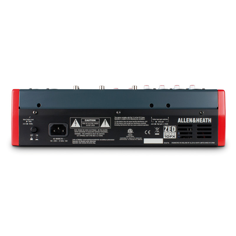 ZED60-10FX est une table de mixage facile à transporter conçue pour les artistes solos et les petits groupes. Basé sur le modèle à succès ZED-10FX, le nouveau ZED60-10FX est doté de faders de 60 mm de haute qualité qui permettent un mixage plus précis. Son design est particulièrement attrayant pour les guitaristes, puisque deux de ses quatre canaux mono ont des entrées haute impédance via jack, qui acceptent les signaux avec des niveaux de ligne normaux ou le signal de faible niveau provenant d'un micro de guitare. Cela permet aux guitares d'être connectées directement à la table de mixage sans avoir besoin de boîtiers DI. Ces entrées ont été réglées pour recréer le son des préamplis à lampes classiques dotés de combos et de têtes d'amplification de guitare, offrant une définition et une chaleur incroyables. Il existe également deux entrées stéréo pour lecteurs MP3/CD ou claviers. Il dispose d'une entrée/sortie audio USB configurable, ce qui facilite l'enregistrement en direct et en studio. La table de mixage est équipée de sorties stéréo principales équipées de connecteurs XLR professionnels, d'une section de monitoring flexible avec sorties casque et haut-parleurs et de 16 effets de haute qualité. Le ZED60-10FX est à la hauteur des normes de qualité qui ont fait d'Allen & Heath l'un des noms les plus respectés de l'industrie audio professionnelle au cours des 40 dernières années.