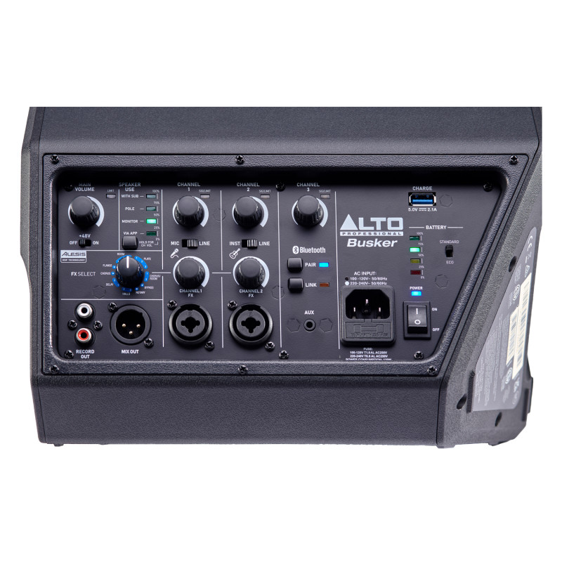 200 W de son puissant portable, avec un woofer de 6,5" et un tweeter de 1" Mode batterie Eco pour augmenter la durée de fonctionnement jusqu'à 24 heures Conception compacte et légère pour un transport facile Application Alto gratuite (iOS/Android) pour la configuration et le contrôle à distance Streaming Bluetooth de musique directement depuis un appareil Mélangeur intégré à 3 canaux, y compris Alesis FX 2 entrées combo XLR/TRS (pour micros, instruments et sources de niveau ligne) Entrée auxiliaire pour appareils non Bluetooth La conception polyvalente permet un placement vertical ou incliné, selon le environnement Peut être utilisé seul ou sur un mât avec un haut-parleur DSP pour le son traité Deux unités Busker peuvent être reliées sans fil via Bluetooth pour une lecture stéréo Placement horizontal ou vertical flexible pour la surveillance