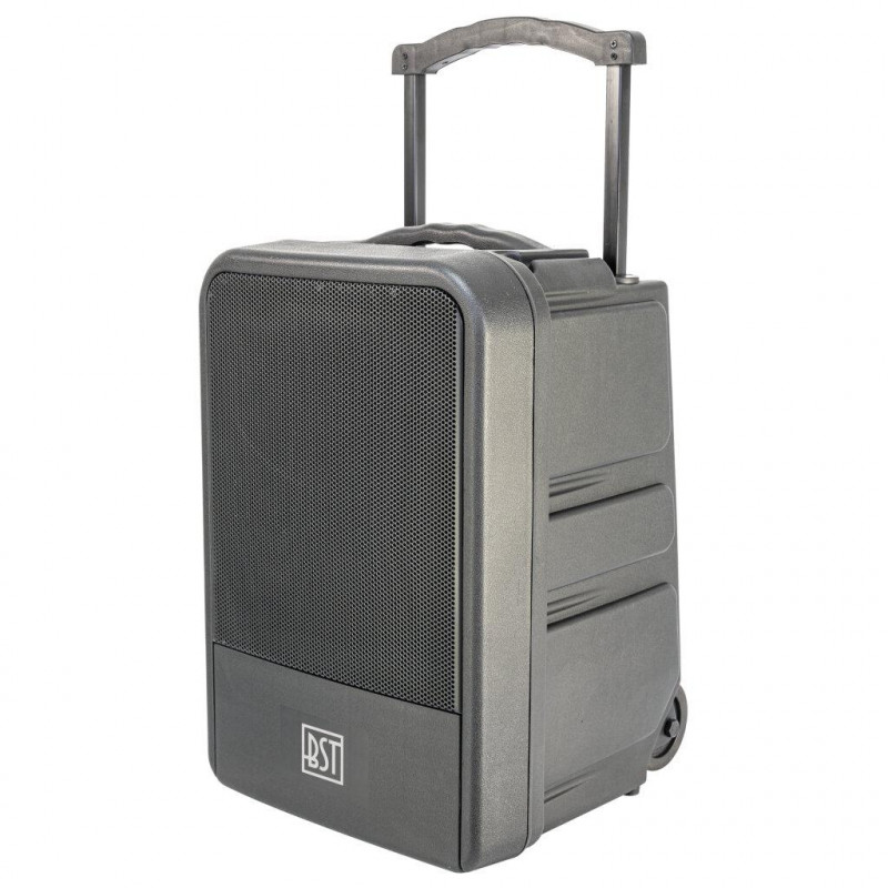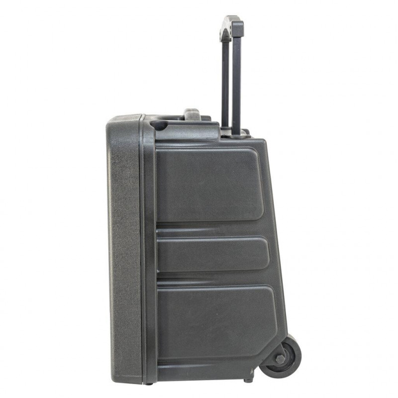 Bluetooth & USB Woofer 25 cm Double récepteur UHF 2 microphones UHF avec système de fixation Télécommande infrarouge avec récepteur supplémentaire en façade Batterie Lithium 25,2 V 8A Chariot et roulettes pour faciliter les déplacements IP54 – Résistant aux intempéries