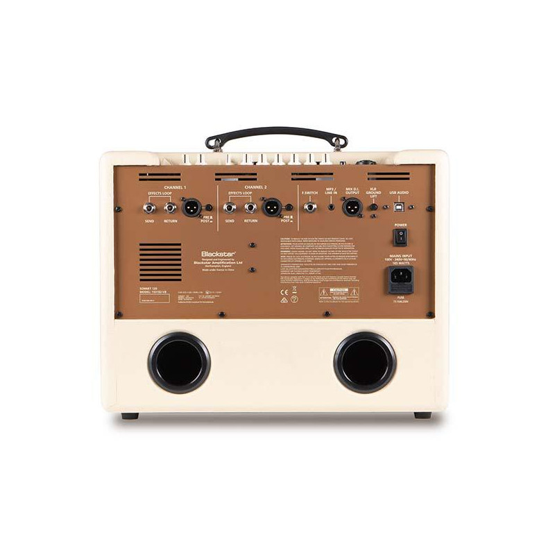 AMPLIFICATEUR DE GUITARE ACOUSTIQUE Le Sonnet 120 Blonde est le combo idéal en déplacement. Cet amplificateur au fini crème, léger et compact d'une puissance de 120W (1x8' + tweeter) est parfait pour vos concerts acoustiques. Doté d'entrées micro et instrument équipées d'un égaliseur et d'une réverbération indépendants, d'effets de qualité studio : Hall et plaque, filtre passe-haut, contrôle de la luminosité, sortie audio USB, sortie mix DI XLR, entrée MP3/ligne, Bluetooth audio, entrée pédale (FS -17) pour le contrôle de la sourdine et des effets. Support inférieur inclinable.
