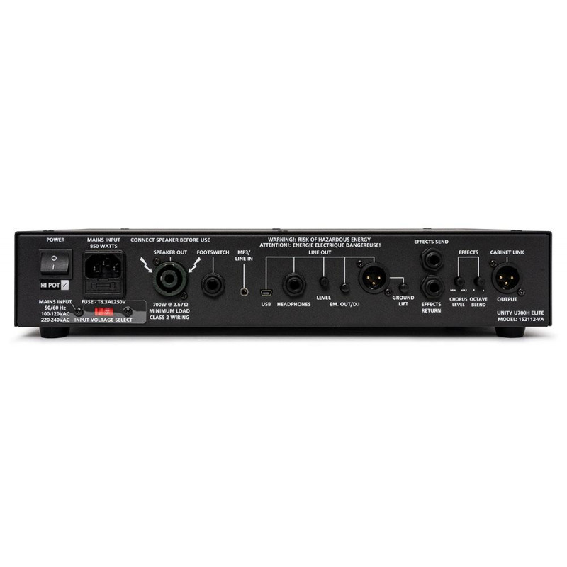 TETE D'AMPLI POUR BASSE' Head Unity ELITE U-700. La large marge de sécurité de l'Elite offre une puissance de 700 W, suffisamment de clarté tonale pour toute situation en direct. Puissance 700 W, (charge minimale de 2,67 Ohms) Voix : classique, moderne, plate. Drive : OD, Dist, Fuzz, EQ semi-paramétrique, Effets : Chorus, Octave, Compressor. Contrôle de niveau, MP3/Line In, Line Out USB, Casque, XLR (Em. Out ou DI), 378 mm X 77 mm X 251,6 mm, 4,2 kg'