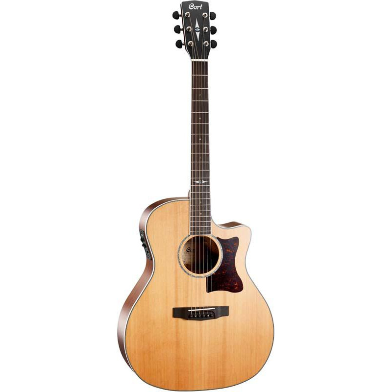 GUITARE ÉLECTROACOUSTIQUE 6 CORDES AVEC CUTAWAY Guitare électroacoustique de type Grand Auditorium avec pan coupé. Table en cèdre massif, dos et éclisses stratifiés en Blackwood d'Australie. Manche en acajou avec touche en palissandre Capo et pont en os authentique. Poupée moulée sous pression. Micro Fishman Sonicore avec préampli Fishman Presys. Finition naturelle satinée.
