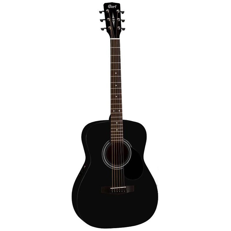 GUITARE ELECTRO-ACOUSTIQUE 6 CORDES Guitare acoustique électrifiée de type folk. Manche en acajou avec touche Merbau Corps en acajou avec côtés et dos, table en épicéa laminé. Préampli Cort CE304T. Fini noir mat