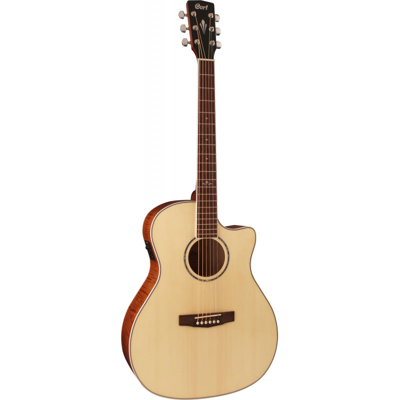 GUITARE ELECTRO-ACOUSTIQUE 6 CORDES AVEC CUTAWAY Guitare acoustique de type Grand Auditorium électrifiée avec pan coupé. Manche en acajou avec touche en merbau et reliure blanche Table, dos et éclisses en épicéa en érable flammé. Capo et pont d'os. Mécaniques moulées sous pression. Préampli Fishman Isys T.Échelle 648 mm (25,5 '). 20 frettes. Finition naturelle brillante.