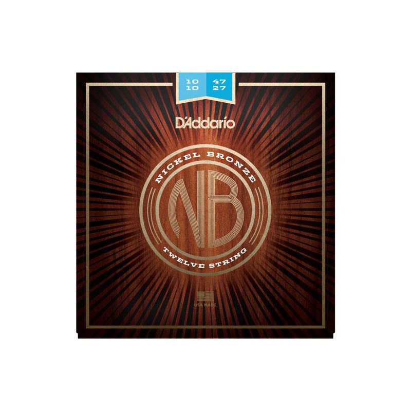 JEU DE CORDES DE GUITARE ACOUSTIQUE Jeu de cordes de guitare acoustique D Addario Nickel Bronze NB1047-12 Pour guitare 12 cordes. Jauges: Acier ordinaire .010 / .10, .014 / .014, Nickel Bronze Wound .023 / .008 (p), .030 / .012 (p), .039 / .018 (p), .047 /. 027 (w) Les cordes Nickel Bronze présentent une combinaison innovante de bronze phosphoreux nickelé enroulé autour d'un noyau en acier NY à haute teneur en carbone.
