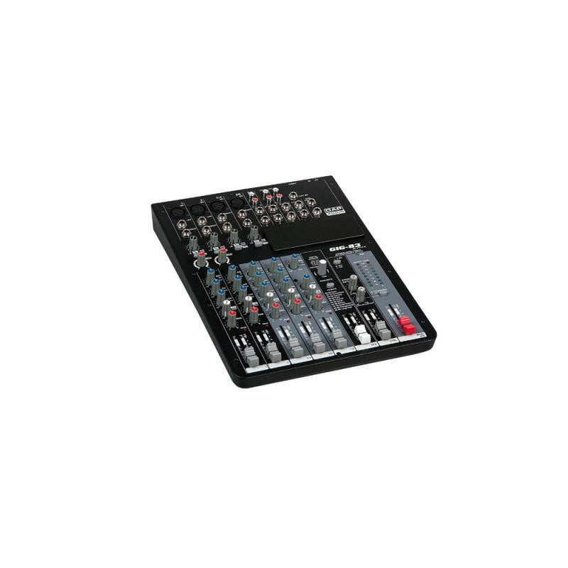 La console de mixage GIG-83 CFX est dotée de fonctionnalités dont ne disposent pas les autres appareils de sa catégorie : 4 entrées mono (fournies avec des préamplis micro à très faible bruit et une alimentation fantôme +48 V) et 3 entrées stéréo. Chacune d'entre elles dispose d'un égaliseur à 3 bandes (fréquences basses, médiums et aiguës), d'un effet DSP 24 bits intégré avec 100 presets, d'un contrôle auxilliaire, d'afficheurs de niveaux à 8 segments très précis, d'entrées bipistes assignables au mixage principal et de sorties contrôle / casque ou groupe.