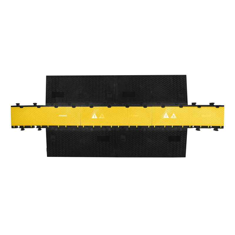 Le système s'étend à souhait, tant en longueur qu'en largeur. La facilité d'accès et la sécurité sont donc assurées, même aux endroits où les cinq canaux ne suffisent pas, comme à proximité des groupes électrogènes ou de la régie. Les câbles du son, de l'éclairage et de l'électricité se posent en toute simplicité et sont ainsi sécurisés. Avec sa structure parfaitement symétrique, la pièce centrale est simple à monter et vous ne perdez jamais votre temps à chercher la pièce rapportée qui convient. Oubliez aussi les plans d'assemblage sophistiqués ! Une fois posées, les pièces centrales symétriques et les rampes en semi-composite assurent une stabilité optimale, tant en longueur qu'en travers. Plus besoin de ces adaptateurs et raccords, si faciles à perdre. La conception des connexions offre suffisamment de jeu pour un montage simple tout en garantissant une résistance adéquate. Si les passages de câble doivent être posés sans rampe, des adaptateurs permettent de connecter les pièces centrales en longueur.