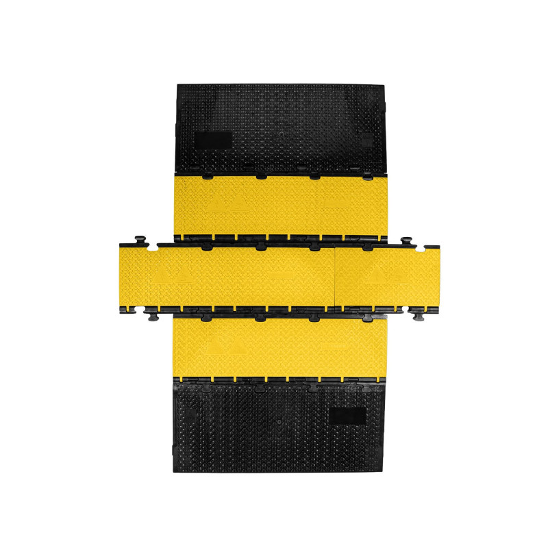 Le système s'étend à souhait, tant en longueur qu'en largeur. La facilité d'accès et la sécurité sont donc assurées, même aux endroits où les cinq canaux ne suffisent pas, comme à proximité des groupes électrogènes ou de la régie. Les câbles du son, de l'éclairage et de l'électricité se posent en toute simplicité et sont ainsi sécurisés. Avec sa structure parfaitement symétrique, la pièce centrale est simple à monter et vous ne perdez jamais votre temps à chercher la pièce rapportée qui convient. Oubliez aussi les plans d'assemblage sophistiqués ! Une fois posées, les pièces centrales symétriques et les rampes en semi-composite assurent une stabilité optimale, tant en longueur qu'en travers. Plus besoin de ces adaptateurs et raccords, si faciles à perdre. La conception des connexions offre suffisamment de jeu pour un montage simple tout en garantissant une résistance adéquate. Si les passages de câble doivent être posés sans rampe, des adaptateurs permettent de connecter les pièces centrales en longueur.