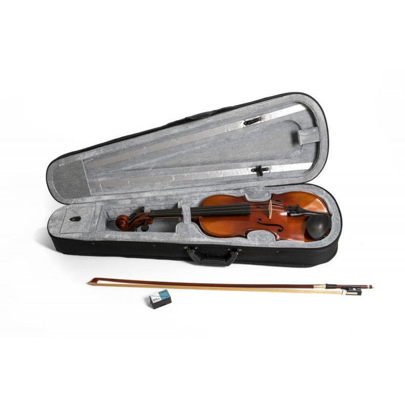 Accastillage en bois dur. Dos et éclisses en érable massif. Table en épicéa massif. Reliure à insert. Vernis rouge-brun foncé. Barbeau. Cordier à réglage fin. Archet massaranduba avec hausse en ébène.