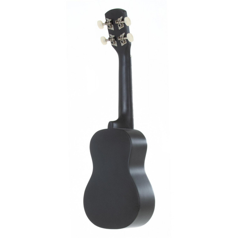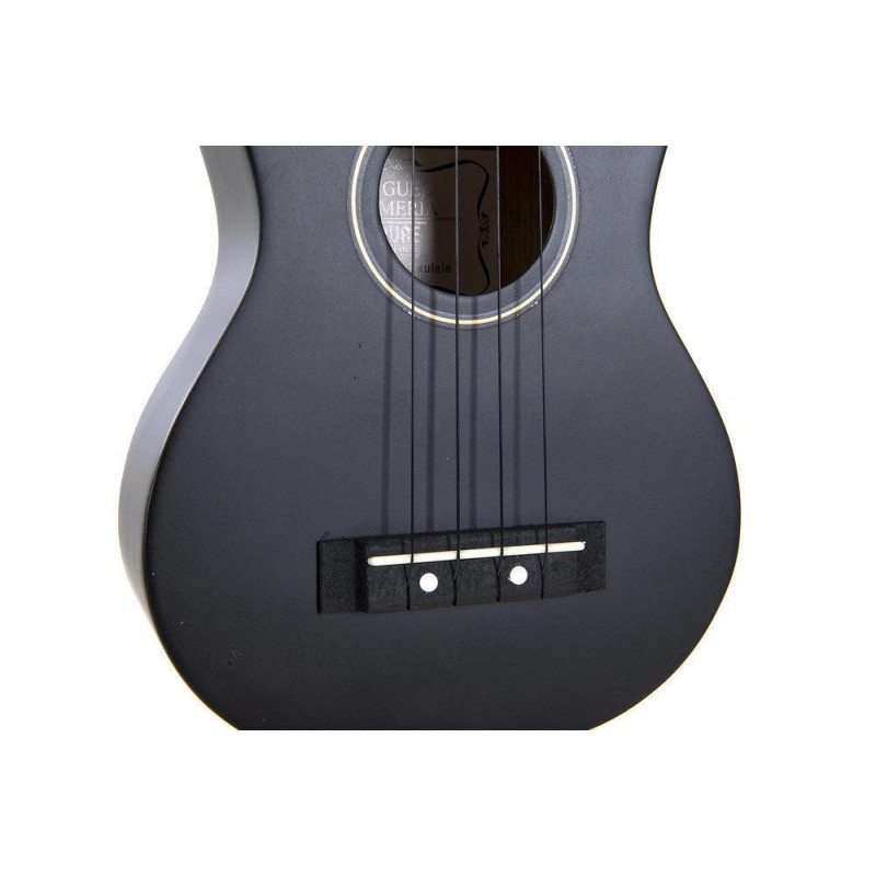 Entièrement en tilleul. Diapason : 350 mm. sillet : 35 mm. longueur totale : 535 mm. Touche et chevalet en bois Pakka. Chevalet et manche incrustés. Tête de guitare ouverte. Cordes en nylon noir. accordage recommandé A. D. F#. Oui. finition mate