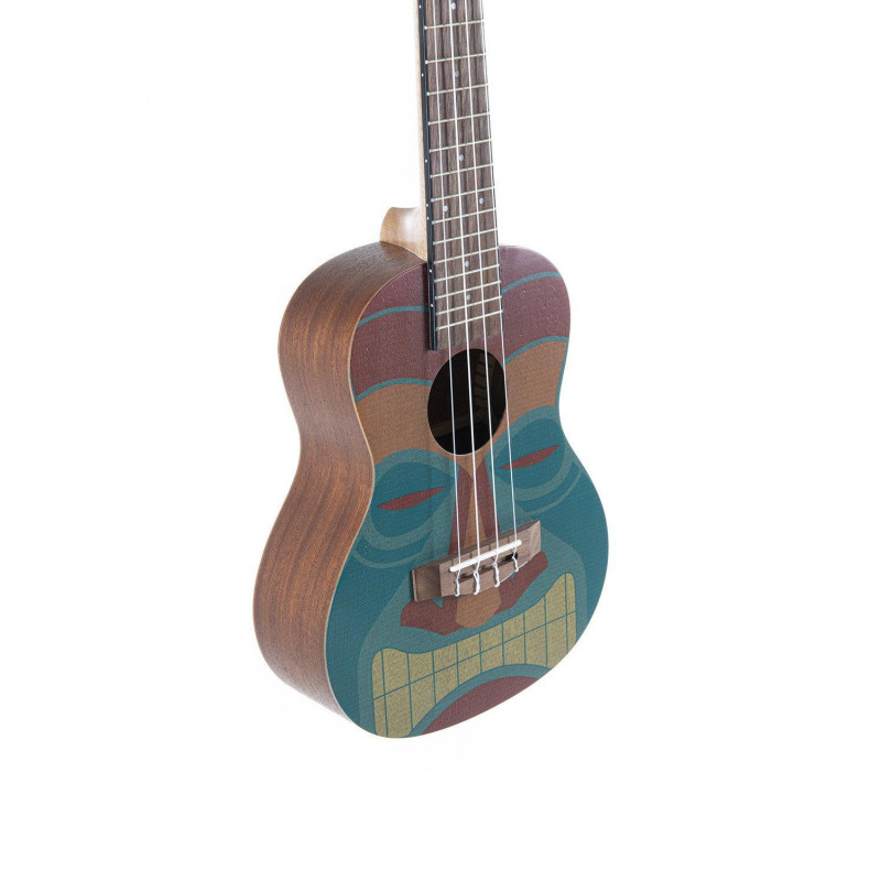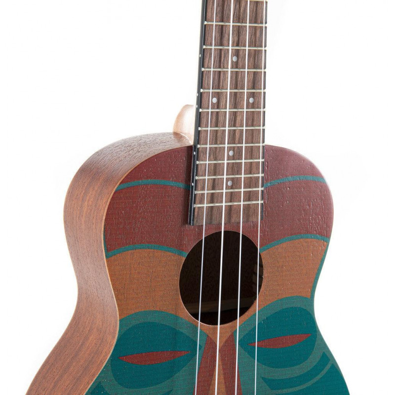 Corps et manche en sapele. Motifs Tiki. Touche et chevalet en noyer noir. Sillet et chevalet en os. Échelle 380 mm. largeur du sillet 35mm. Chevilles de machine ouvertes chromées avec boutons noirs. Cordes Aquila. Finition mate à pores ouverts soyeux. Incl. mallette de voyage capitonnée.