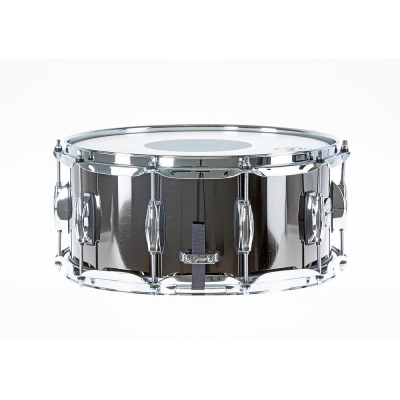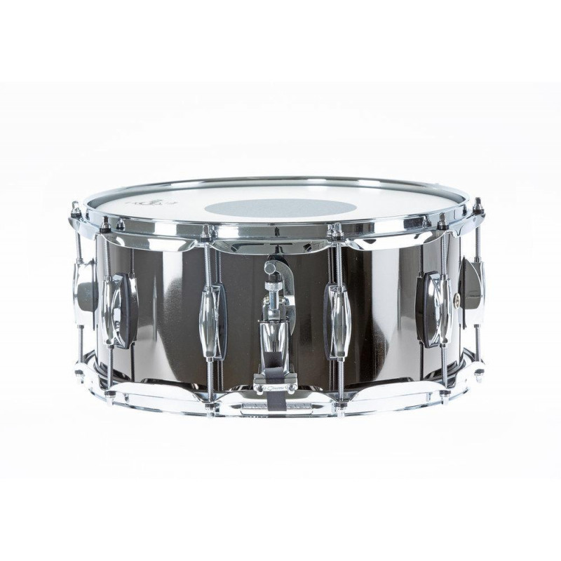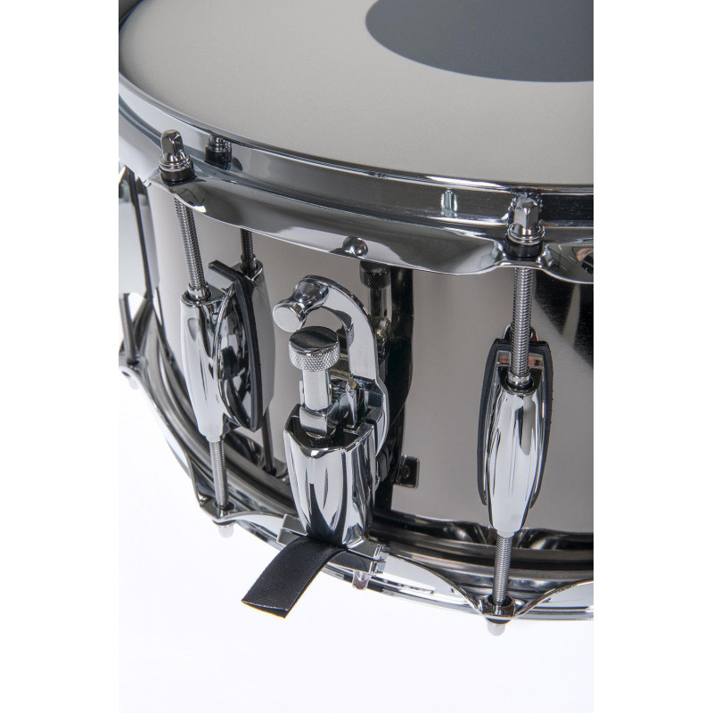 Nickel noir sur acier. coque en acier de 1. 2 mm. bords à 45º. cerceaux en acier à triple profil de 2. 3 mm. système de caisse claire à 20 fils. têtes Remo.