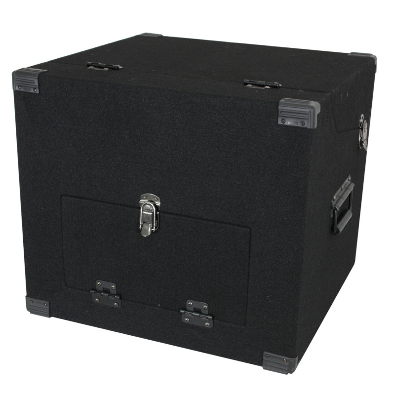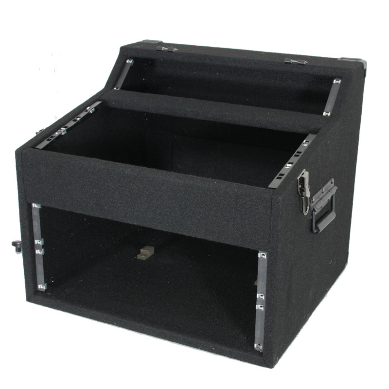 Flight case pour équiper une cabine mobile. Fabrication de qualité en MDF 19 mm entièrement recouvert de moquette noire. Equipé de poignées, coins et fermetures. Ouverture du hayon arrière pour passer les câbles. Trois sections avec rails 19" pour fixer le matériel :