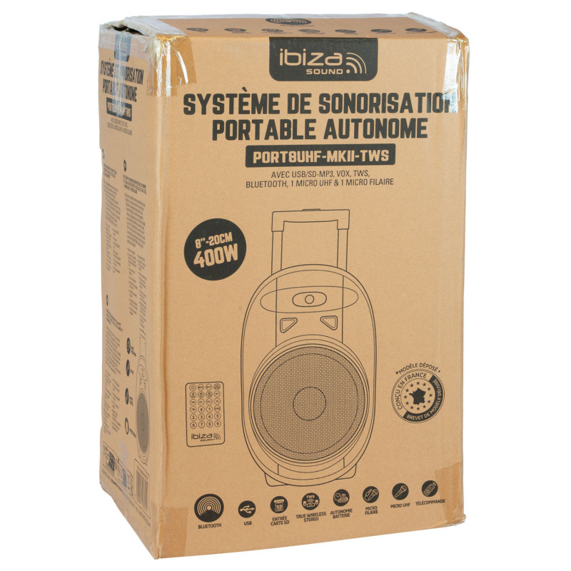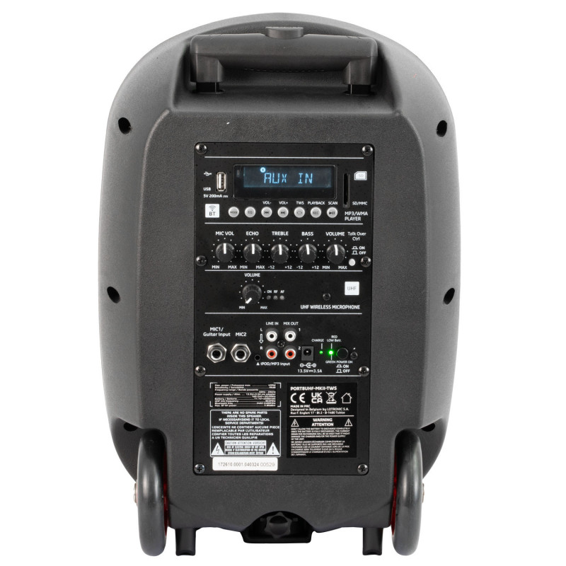 Ce système audio portable offre une qualité sonore exceptionnelle. Equipé d'une batterie rechargeable intégrée, ce système assurera une autonomie de plus de 5 heures. Son chariot rétractable et ses roues en polyuréthane à roulements à billes vous permettront de l'emporter facilement avec vous. Son microphone sans fil UHF professionnel et sa télécommande offrent une polyvalence et une liberté de mouvement optimales, sans oublier sa simplicité d'utilisation grâce à son écran rétroéclairé. Ce système ultra-polyvalent sera très utile dans de nombreuses situations : clubs de sport, discothèques, bars, terrasses, intervenants, chanteurs et musiciens, en intérieur comme en extérieur… Grâce à ses nombreuses entrées et sorties USB/SD/Ligne/Micro, l'entrée multisource couvrira tous vos besoins et supports numériques.