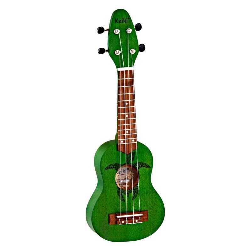 UKELELE SOPRANINO Ukulélé Sopranino Keiki K1-MM. (plus petite que la soprano, échelle 248 mm). Finition satinée en vert. Corps et manche en okoumé, touche et chevalet en noyer. Couvercle Okoumé gravé au laser d'un motif «tortue». Mécaniques chromées et noires. Assemblez les cordes Ortega UWNY-4-SO pour Soprano standard.