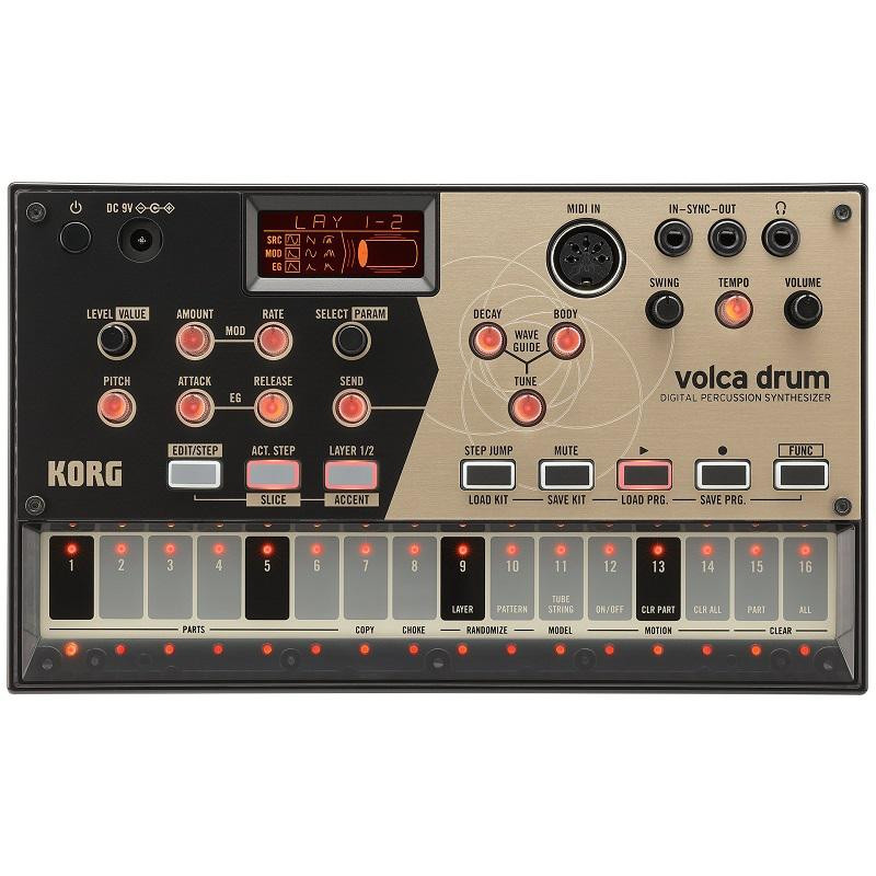 SOUND MODULE OR SYNTHESIZER Digital percussion synthesizer. 6 part x 2 layer structure. Distinctive sound powered by a newly designed DSP engine. Waveguide resonator. 16-step sequencer with a wide range of parameter automation. Active Step, Slice, Accent, Choke functions. Two random functions. LCD screen. MIDI connection. Powered by AA batteries or KA350 power supply (optional). Includes: 6 AA alkaline batteries, Sync cable.