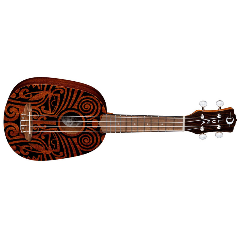 La ligne de ukulélés en acajou "Tribal" de Luna combine le meilleur des profils traditionnels et de la sélection de bois avec l'ornementation du corps hawaïen, les esprits gardiens entrelacés et les aspirations contemporaines. Cet ukulélé tribal s'inspire des sculptures traditionnelles du Pacifique. Les dessins sont monochromes, tatoués en noir avec des motifs fortement géométriques, et de nombreuses formes et symboles inspirés par les guerriers tribaux. Ce Uke présente un corps en acajou de l'Est, un manche serti, une touche en noyer et des incrustations de points de perle. Un magnifique motif "ananas", combiné à une construction de qualité et à un excellent rapport qualité-prix, en font un "meilleur achat" pour une grande variété de joueurs et de styles.