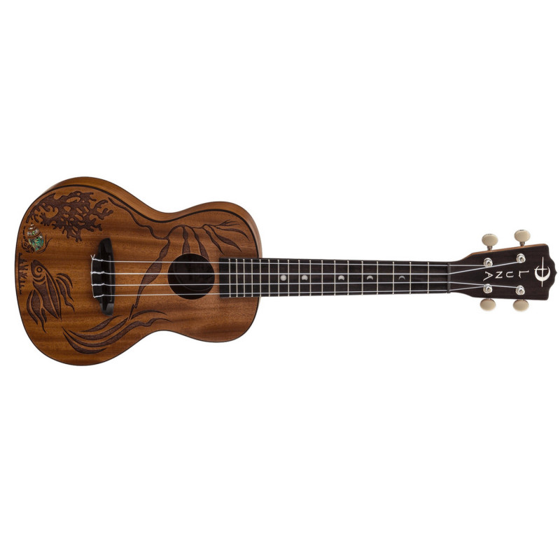 L'élégant poisson gravé qui reflète les feuilles des algues, symbolise la fertilité, l'éternité, la créativité, le bonheur, la parentalité, la fidélité et la transformation. La forme en spirale de la coquille d'ormeau symbolise l'évolution et la croissance holistiques, l'abandon, la libération et les révolutions du temps, des étoiles, des planètes et la géométrie de la croissance naturelle observée dans la nature. Le Luna Uke Coral est destiné aux vrais passionnés de Uke. Ce ukulélé à corps en acajou massif présente une construction à manche fixe, avec une finition naturelle satinée, une touche en noyer, des incrustations de points de perles "Moon Phase" signature de Luna, finies avec une incrustation de poisson ormeau sur le corps. Le Coral Uke est l’un des meilleurs ukulélés fabriqués par Luna.