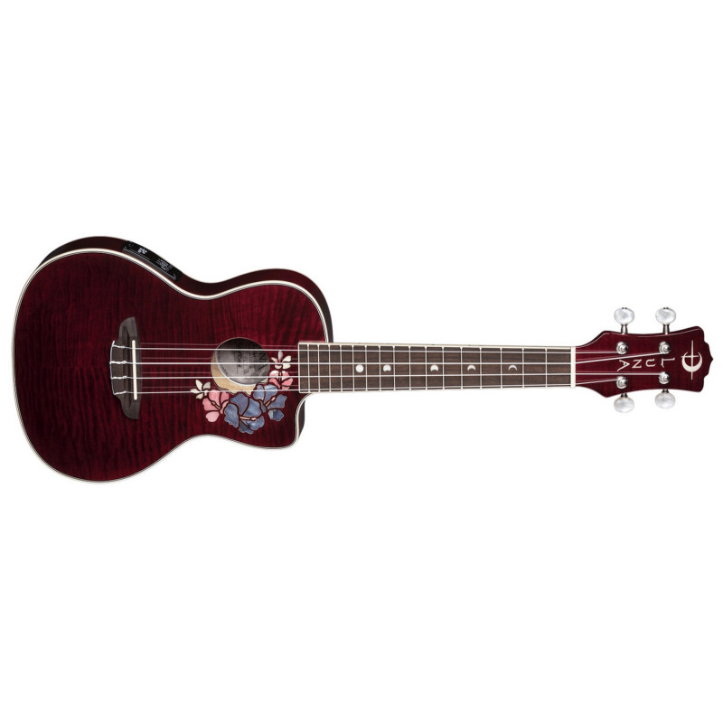 Le ukulélé concert Luna Guitars Flora est orné d'incrustations d'hibiscus et de plumeria autour de la rosace. L'hibiscus est la fleur nationale d'Hawaï. Parce que la floraison ne dure que peu de temps, chaque jour, elle envoie un message pour « saisir le jour » et symbolise une beauté délicate. Plumeria est un symbole du printemps et est donc associé à la naissance et à la vie. Ce magnifique ukulélé Luna est doté d'une table et d'un corps en érable flammé violet vif, qui produisent un son équilibré et plus profond avec la taille du corps de concert. Le pan coupé offre un confort lors de l'accès aux frettes du registre supérieur, et le manche en érable, le chevalet et la touche en noyer ajoutent un sustain et une clarté durables à votre son. Les accordeurs de style ouvert de ce Uke de concert aident à maintenir l'instrument dans un accord précis et le préampli intégré fournit une amplification facile qui peut être facilement ajustée. La magnifique table en érable flammé est complétée par un corps en érable, un manche en acajou et une touche en noyer. Un ukulélé qui joue aussi bien qu'il en a l'air !