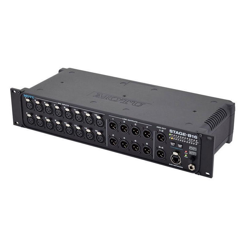INTERFACE AUDIO HYBRIDE (DIVERS SYSTÈMES) Stage-B16 est une unité conçue pour des applications scéniques flexibles. Il s'agit d'une interface audio autonome complète et d'une table de mixage avec des entrées analogiques de qualité studio, des fréquences d'échantillonnage jusqu'à 192 kHz, un puissant DSP pour le mixage et le traitement des effets, et une connectivité aux serpents numériques, à la mise en réseau audio régulière ou à un ordinateur hôte via AVB Ethernet. protocole ou un type compatible, Hi-Speed USB 2.0 (compatible avec USB 3.0 et iOS).