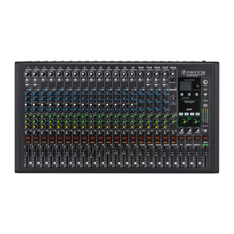 BUREAU DE MIXAGE Le mélangeur analogique 24 canaux premium Mackie Onyx24 avec USB est la solution compacte ultime pour les performances live, l'enregistrement à domicile et la création de contenu. L'enregistrement multipiste 24 bits/96 kHz, les préamplis micro Onyx à gain élevé primés et une conception de bout en bout à très faible bruit offrent la qualité sonore exigée par les professionnels. Doté de fonctionnalités comprenant de puissants effets DSP, un égaliseur Perkins de style britannique, un écran couleur et un enregistrement et une lecture intégrés à partir d'une carte SD. Le mixeur analogique premium Onyx24 vous offre la puissance dont vous avez besoin pour capturer vos meilleures performances avec une fidélité impeccable à la maison ou en déplacement.