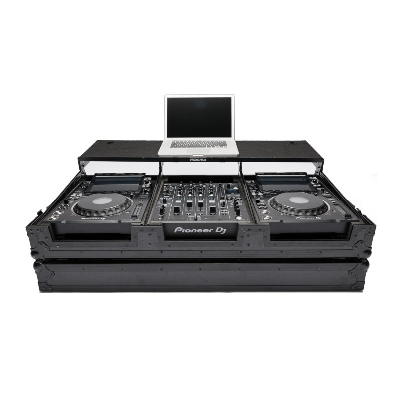 Flightcase pour le transport et le rangement d'un jeu de 2 joueurs et 1 mixeur. Construction robuste en contreplaqué laminé en vinyle de 9 mm. Profilés élégants en aluminium massif noir et loquets à ressort. Comprend une plateforme coulissante (amovible) pour l'ordinateur portable et des équipements supplémentaires. Mousse supplémentaire pour s'adapter à différents modèles de mixeurs et lecteurs CD. 3 caches de façade amovibles. Ports d'accès aux câbles pratiques. Intérieur entièrement rembourré. Comprend des roues encastrées pour un transport facile. Compatible avec Pioneer DJM-900 NXS2 / 900 NXS / SRT / 800 / 700 / 600, CDJ-2000NXS2 / 2000NXS / 900 / 850 / 800 et XDJ-1000, Allen & Heath PX5, DB4, DB2, Xone 92 / 62 / 43C , Denon SC-6000 / 6000M / 5000 / 5000M / 3900 / 2900, Denon 0,5 x 56 x 24,5 cm. Dimensions internes : 39,5 x 32 x 8,4 cm (lecteur) / 43,8 x 33,1 x 8,4 cm (mixeur). Poids : 25kg