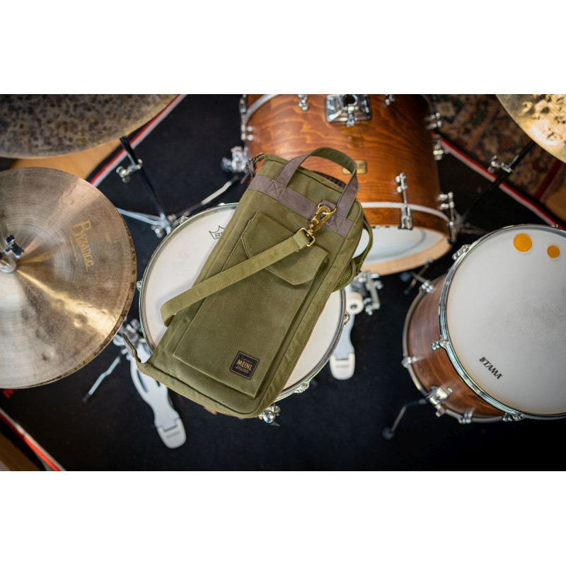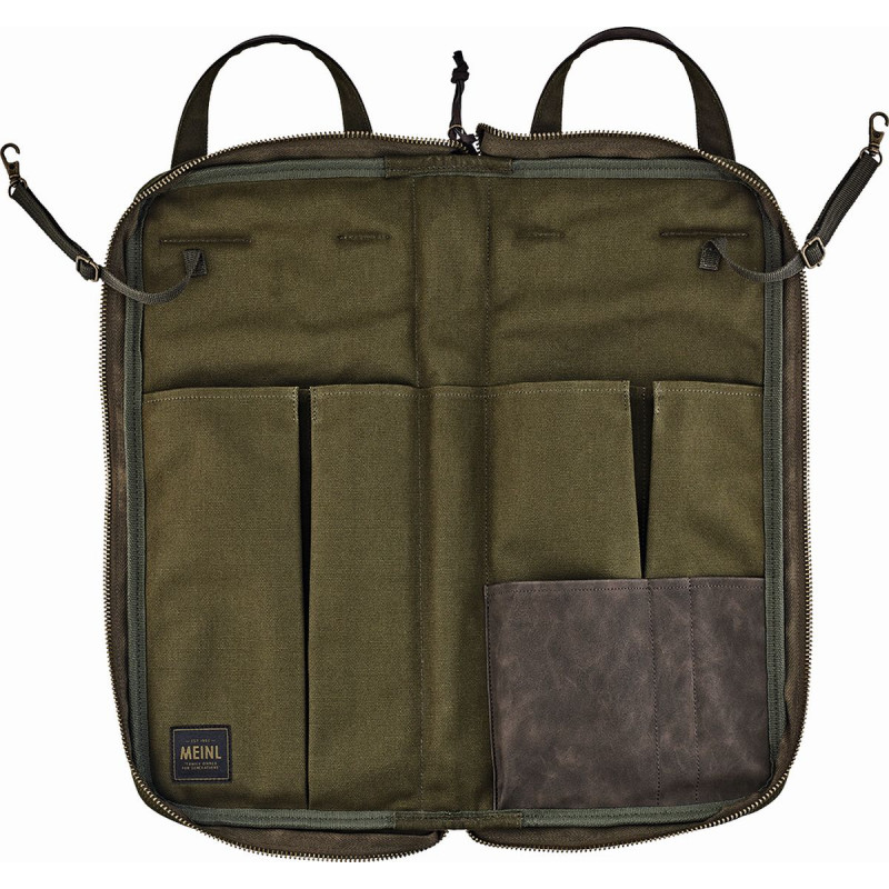 A l'intérieur du compartiment principal se trouvent cinq poches pour organiser un grand nombre de baguettes, brosses, baguettes et maillets (quatre grandes poches à soufflet plus une petite poche sur le rabat intérieur). De plus, il existe trois poches pour accessoires de différentes tailles pour vos petites pièces ou effets sonores.